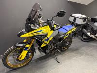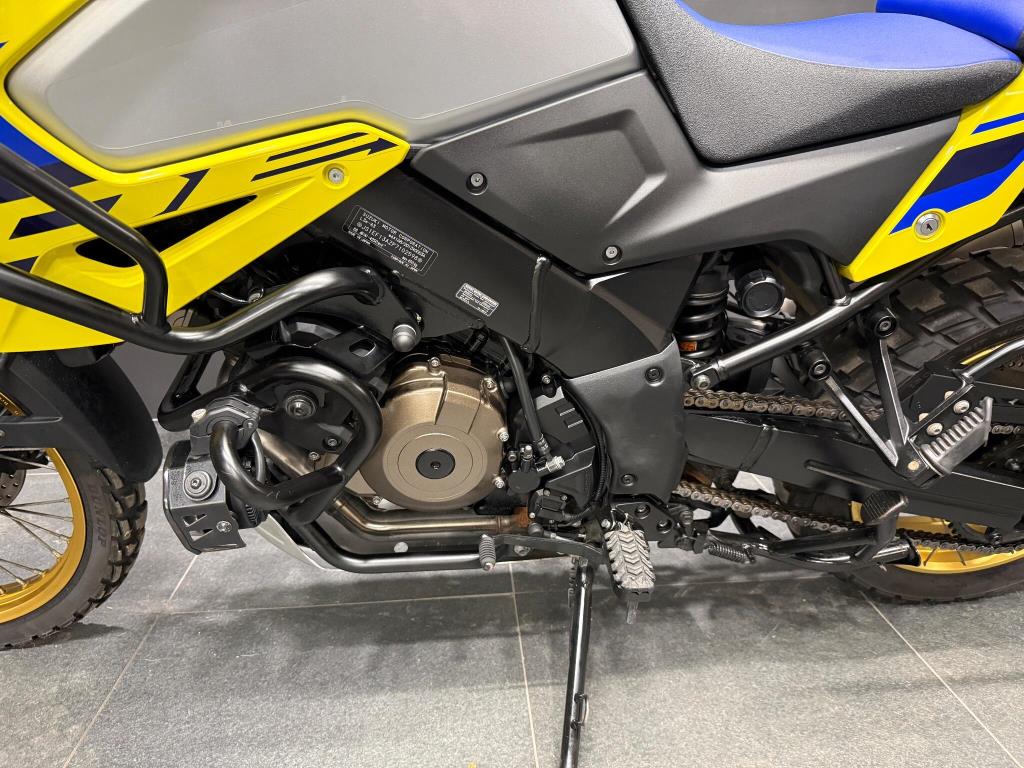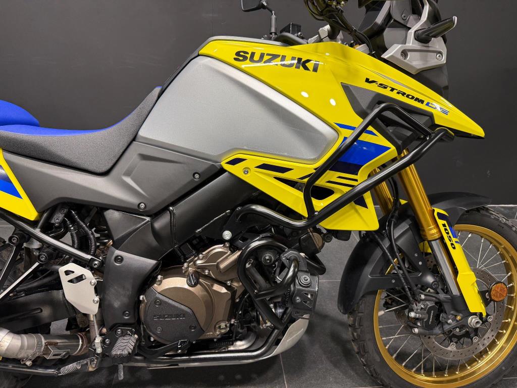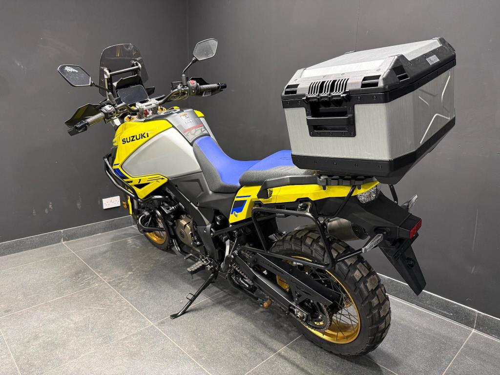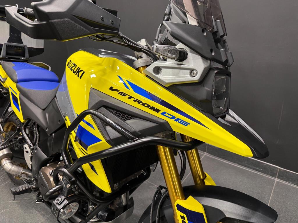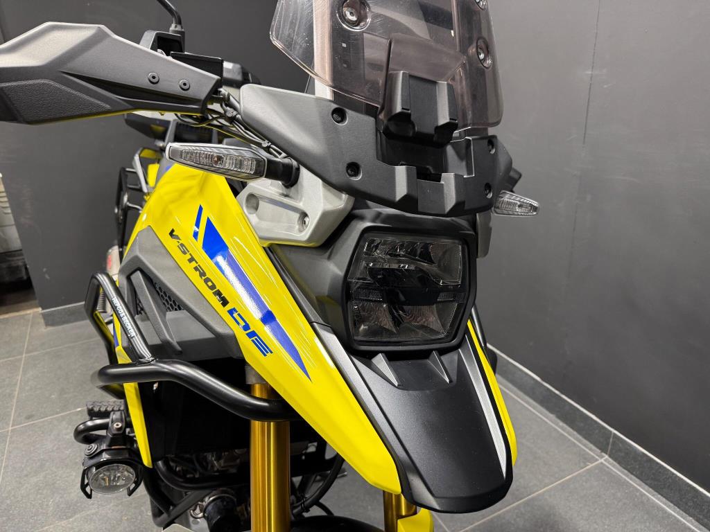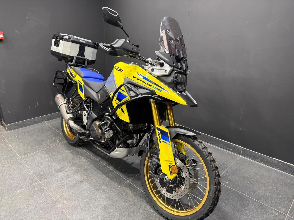 2023 Suzuki Vstrom 1050 DE: Excellent condition machine finished in the best Suzuki colours of Yellow w/blue seat! The latest Vstrom comes equipped with cruise control, heated grips, traction control, rider modes, ABS, fully colour TFT screen, engine bars, LED spots and alloy top box. A fantastic looking adventure touring machine with gold rimmed spoked wheels and comfortable riding position all powered by a torque V-twin motor giving a great sound and smooth power to the back wheel. All books and keys are present.
